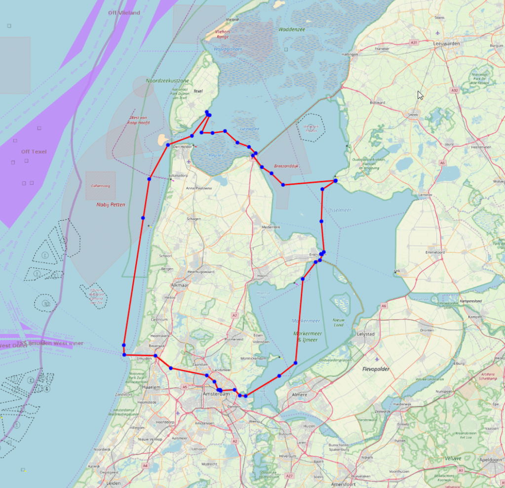Am Samstag laufen wir, tideabhängig, möglicherweise noch vor Sonnenaufgang aus Oudeschild aus. Durch Marsdiep und Schulpengat, der Tiefwasserverbindung zwischen Texel und Den Helder, verlassen wir das Watt und segeln die holländische Küste südgehend in Richtung IJmuiden. Durch die großen Seeschleusen laufen wir in den Nordzeekanal ein, welcher uns nach Amsterdam bringt.